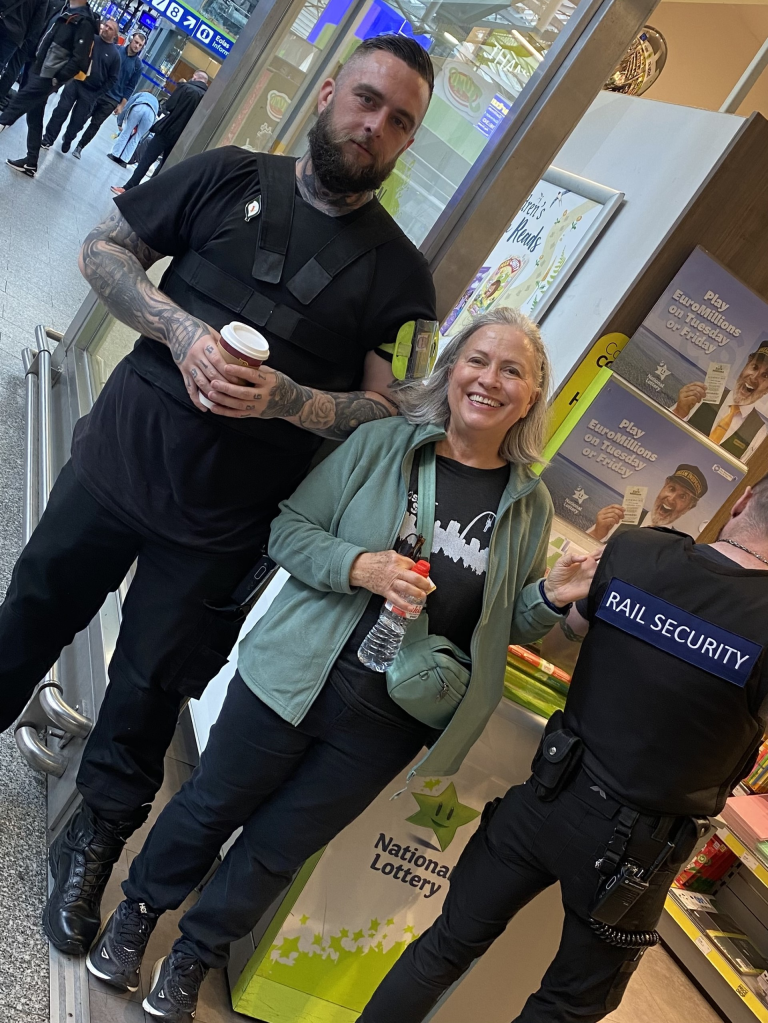 He looked a bit scary and I told him so! I walked right up to him after his chase and said “You look so big and scary .” Then I told him that I felt completely safe in the train station knowing he was there. He laughed and we became good friends. Every time I get on or off the train in Dublin I go over and say hello and buy him a coffee.