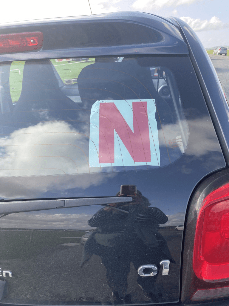 All new drivers have to tag their cars front and back with a big N – for new -for 2 whole years!