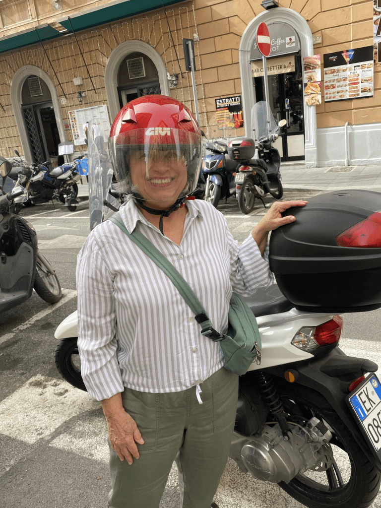 He replied with the most charming Italian accent “Come on, please don’t be afraid to have an adventure.” This guy did not know who he was talking to when he spilled out the word “adventure,” which is my middle name. And who could say no to that Italian accent. So, I donned the helmet and jumped on the scooter. Well, not exactly “jump” but come on, I am 70.