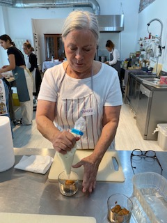 We made tiramisu and learned that the word literally means “lift me up” which it always does when eaten. The eggs have to be beaten just right. Tira- lift, mi – me, su -up.  She said she never uses any liqueur like Marsala – she said it sets off the taste. But then she added “Well, if you like, go ahead.”