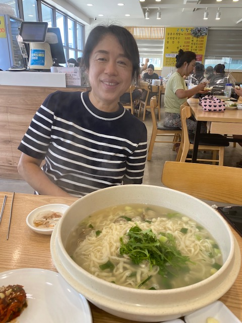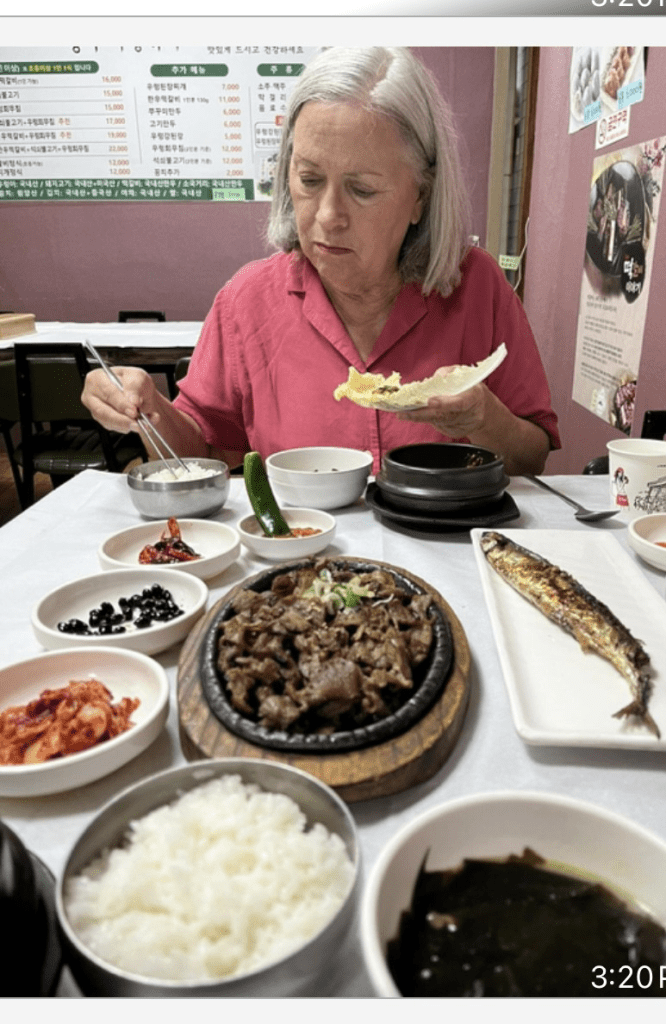 Another student introduced me to a typical Korean Bibimbop meal. We first go to the “lettuce” bar and pick out the types of lettuce and cabbage leaves we like and load up our plate. After that, return to the table and load them with various fish, meats, rice, beans, and sauces before folding and consuming them. We always manage to converse and have a fantastic time, even though none of my pupils would be considered fluent. We intend to continue our English lessons via What’s App for as long as they want. It is one of the benefits of working”gigs”- meeting the locals and learning more about the culture.