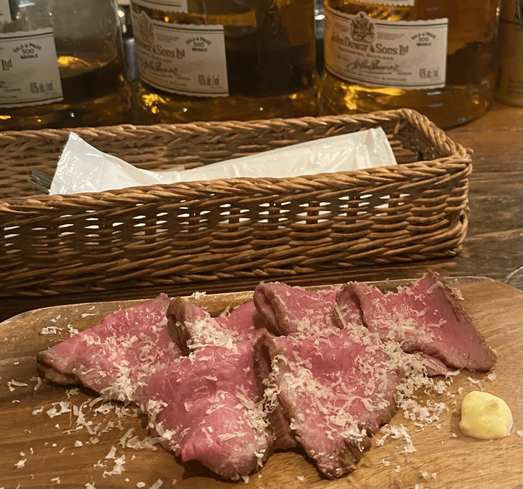 The meat is valued for its flavor, tenderness and fatty well-marbled texture. Rumor has it the cattle are served beer or sake with their meals while being brushed and petted and classical music played in the background. That rumor is disputed, but I do know they eat mainly rice and any leftover vegetation from making beer and sake. In general, they are not raised on huge crowded farms but are being raised in a comfortable pleasing environment.