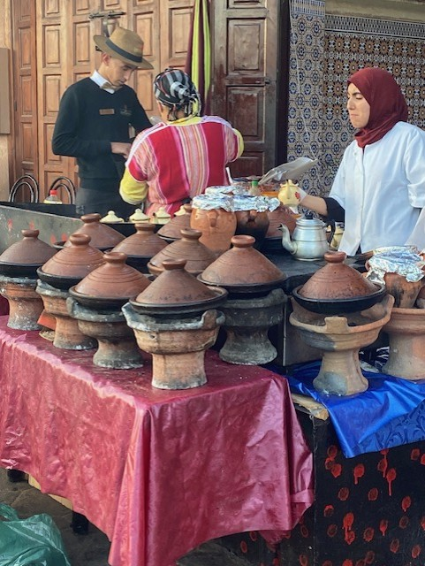 On the third day He created dry land-and I decided to go to the dessert! The desert is encircled by the stunning Alter mountains, which are adorned with snow-capped peaks. Spectacular!! I enjoyed a picturesque camel ride at sunset, leading me to the edge of a dome in the desert, and it was truly an unforgettable experience. In fact, the process of mounting and dismounting the camel was an adventure in itself. We ended the camel ride at a tent area where we were served a dinner of Tagine, a traditional Moroccan dish prepared in a small clay pot, conical shape, which is suppose to circulate the steam with very little water. It can be beef, lamb or chicken with lots of vegetables and couscous.