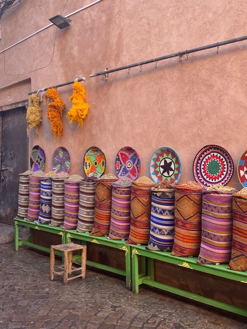 My hotel was next to a large popular mosque and the bells rang and a voice sang out the prayers at sunrise, sunset and a few times in-betweens. On the opposite side was the medina which is a densely packed, walled medieval city dating to the Berber Empire, with mazelike alleys where thriving souks (marketplaces) sell traditional textiles, pottery and jewelry and this is where my hotel was situated, in the heart of the medina.